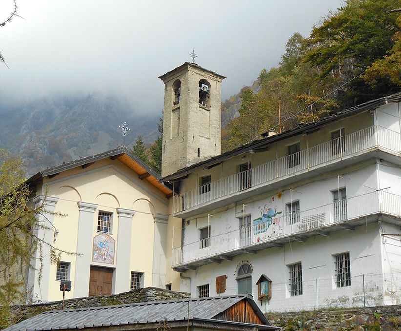 L'edificio attuale è del 1817 ed è affiancato dalla "Casa del Cappellano", costruita nel 1879, sede anche della locale scuola attiva fino all'immediato dopoguerra. La chiesa, dapprima dedicata alla Madonna, fu edificata agli inizi del sec. XVII ed è citata per la prima volta nella visita pastorale di Mons. Ceva del 1616. Nella visita successiva del 1647 è dedicata a San Rocco ed ai primi del '700 anche alla Madonna del Suffragio. L'interno presenta la volta affrescata nel 1877 dal pittore Stefano Bonino da Strambino e conserva una pala d'altare settecentesca con colonne tortili ed una tela che faceva parte dell'altare del Suffragio, che reca una firma cancellata e la data "1855", raffigurante le anime del Purgatorio, la Trinità, la Vergine e San Michele.