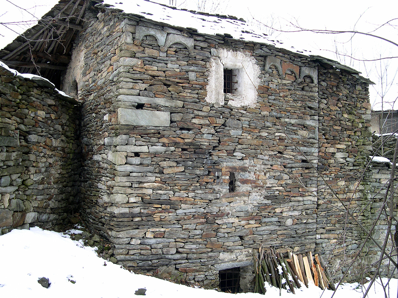Davanti alla chiesa di Sant'Anna vi è una casa romanica che porta la data del 1659: presenta due portoni in legno scolpiti, posti in ingressi con stipiti in pietra ed arco; vi è pure un balcone di legno con parapetto a listelli sagomati. Sotto lo spiovente vi sono degli archetti di pietra, ricavati da lastre di ardesia, a sostegno del tetto. Un'altra casa, più piccola e situata verso le case sotto il campanile, porta la data del "1624": ha una scalinata in pietra che sale alla porta del primo piano con parapetto di pietre: questa riporta però i segni evidenti di rimaneggiamenti più recenti.