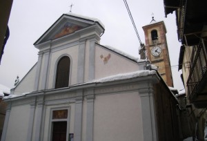 È ignoto l'anno di fondazione: sappiamo però che già nel 1329 le funzioni erano da molti anni trasferite da Santa Croce in un'altra chiesa situata a valle, dedicata ai Santi Salvatore e Giacomo, corrispondente all'attuale parrocchiale. L'edificio subì nei secoli numerosi restauri e rimaneggiamenti, in particolare tra il 1745 e il 1750, quando fu ampliata per aumentarne la capienza; di nuovo nella seconda metà dell'800 ed all'inizio del '900 l'edificio fu rinnovato. La facciata, in stile romanico-barocco, fu interamente rifatta nel 1908. L'interno a tre navate ha la volta centrale affrescata con pregevoli pitture del 1908, eseguite dal pittore Giovanni Silvestro da Montanaro, sovrapposte alle pitture del 1821 del pittore Michelangelo Bianchi. I due coretti furono fatti costruire dal Prevosto Don Faletti nel 1882 per ampliare il presbiterio. AltareL'ex-altare della Madonna del Rosario presenta quindici formelle lignee raffiguranti i misteri del rosario, già citati nella visita di Mons. Asinari del 1647. Sopra l'altare maggiore vi è la pala ovale del 1897 raffigurante l'Assunta, San Giacomo e San Giovanni evangelista del pittore Stornone d'Ivrea, come dello stesso artista è la tela del 1890 riproducente "Il transito di San Giuseppe". La statua di San Giacomo risale al 1886, quella della Madonna del Rosario è del 1894 e la bellissima statua lignea del Cristo morto è verosimilmente di fattura quattrocentesca.