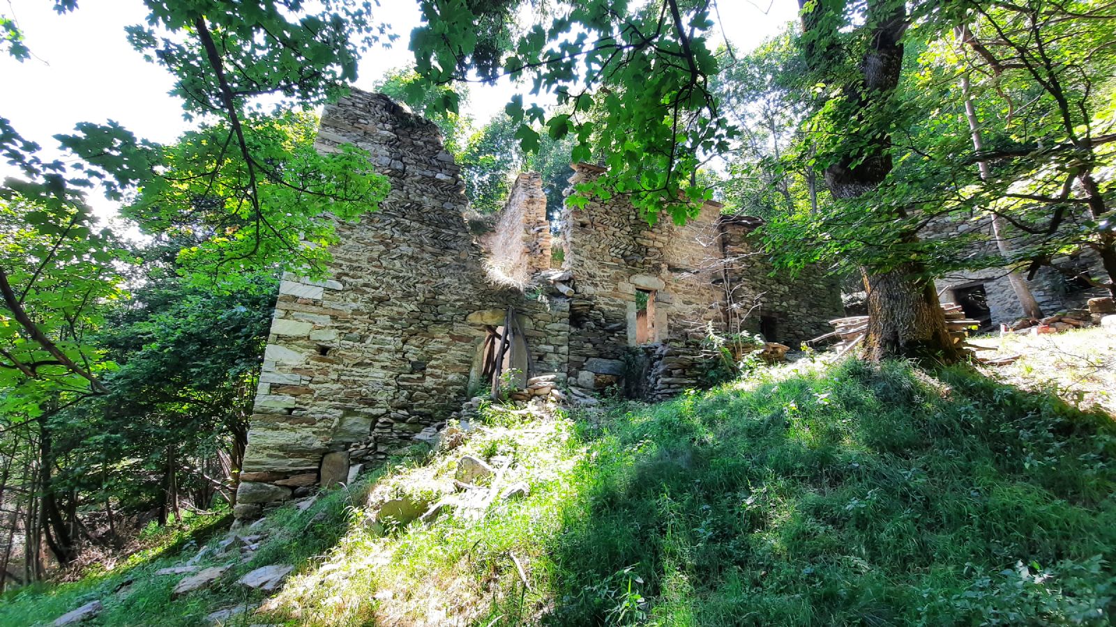 Dopo circa 45 minuti di cammino si giunge alla prima borgata, Prantunera, indicata su un cartello di legno. Si prosegue fino alla seconda borgata, Costa ëd Pracion per poi attraversare un rigagnolo; poche centinaie di metri dopo si attraversa la borgata di Courgnana. Da lÏ il sentiero sale gradatamente fino alla borgata Scialva, un pugno di case avvolte dal bosco. Prima di lasciare la borgata Ë visibile un bellissimo abbeveratorio in pietra, dalle dimensioni ìciclopicheî, che la leggenda nomina ìdi Re Arduino.